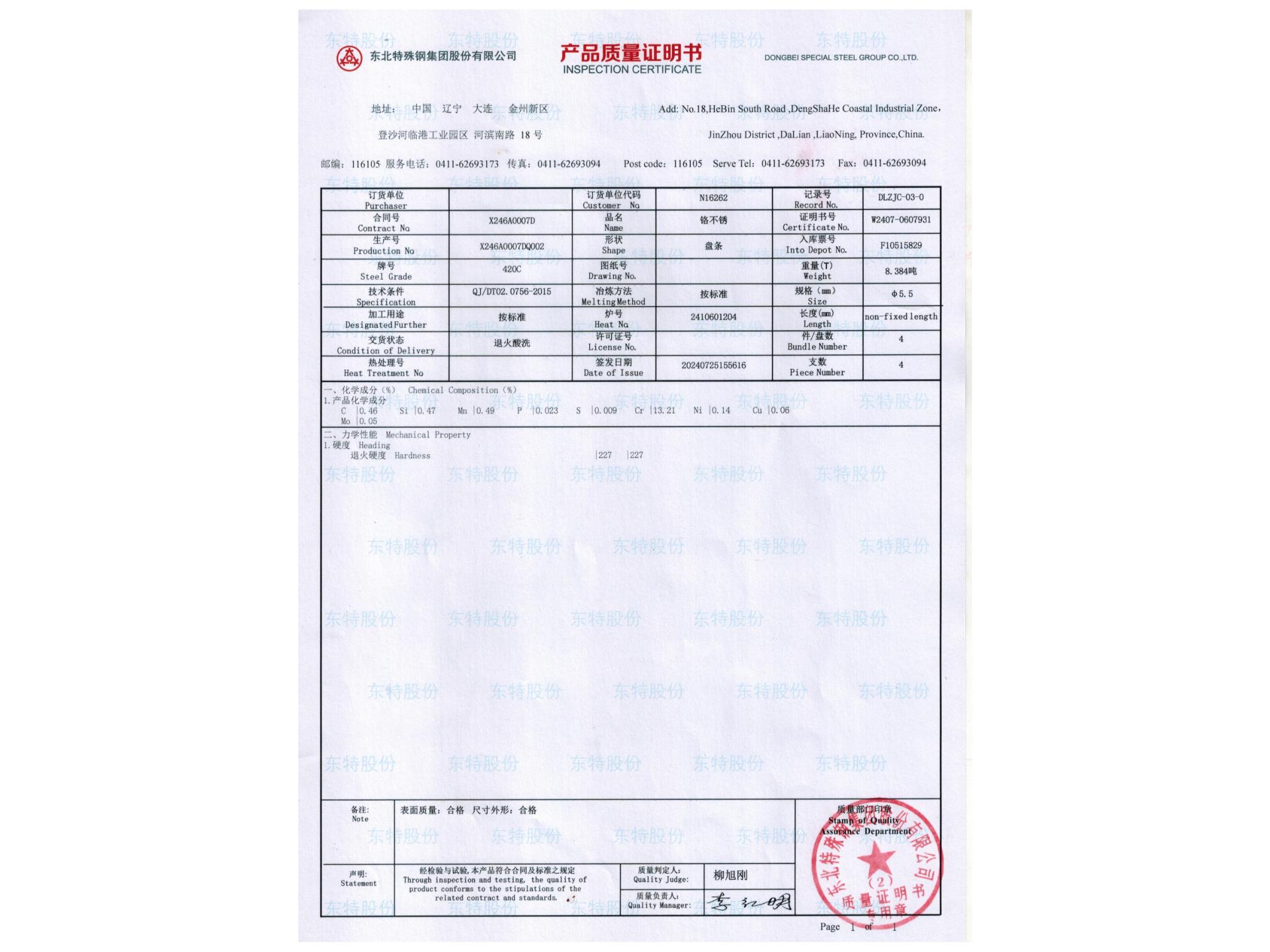 6. 特性:420/420C不锈钢金相组织为马氏体钢,具有中等至良好的耐腐蚀性和良好的材料强度。可抵抗酒精、氨、食品环境、淡水、许多石油产品和有机材料以及一些弱酸环境的腐蚀,适用于对不锈钢普通要求的工作环境中。